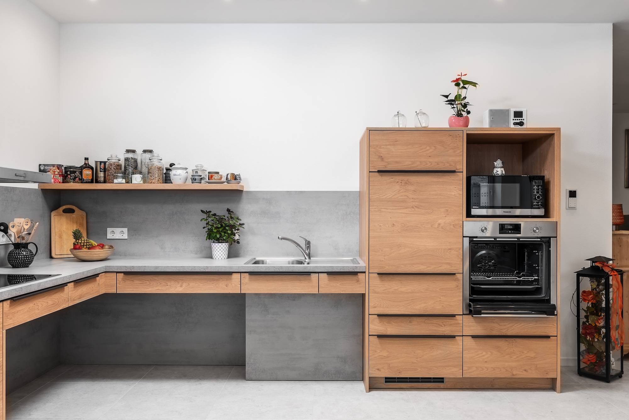 Na primer kombinacija barve Fjord Grün in antracitnega pulta ustvarja presenetljivo izjavo: sveža, moderna in polna globine. Nežen zelen ton v prostor vnaša življenje in lahkotnost, temni antracit pa zagotavlja elegantno osnovo. Idealno za tiste, ki imajo radi drzne barvne poudarke.
